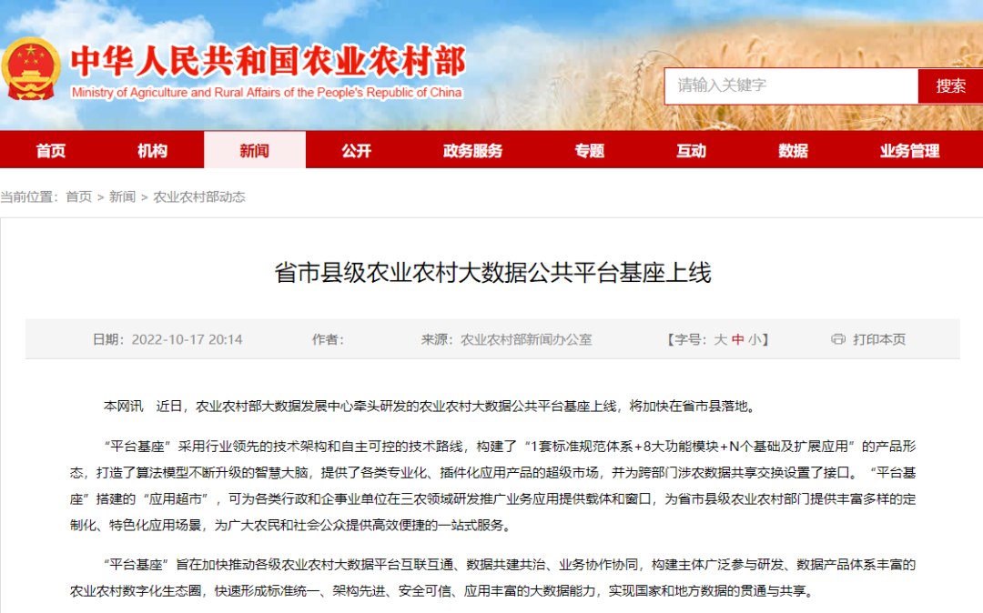 近日,农业农村部大数据发展中心、神州信息共同研发的农业农村大数据公共平台基座上线,将加快在省市县落地。该平台的上线将与已经落地的省级“平台基座”实现联通,更好地促进数据资源纵横贯通,提升农业农村部门数字化治理能力。