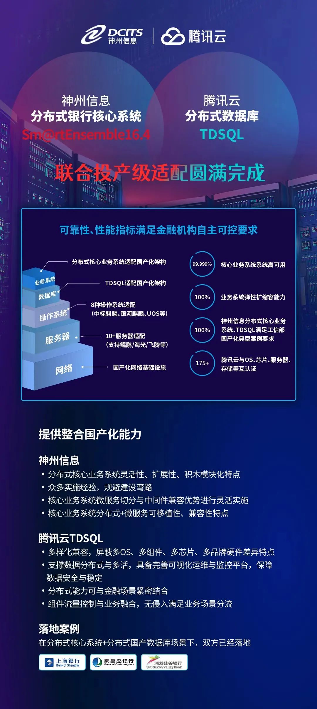 神州信息与腾讯云严格按照商业银行的金融级生产要求,在双方技术团队的协同配合下,历时5个月成功完成神州信息分布式银行核心业务系统Sm@rtEnsemble16.4与腾讯云分布式数据库TDSQL的投产适配。分别在集中式和分布式环境下,对核心业务系统的各项功能和技术性能进行了深度验证。投产结果表明双方产品经过适配、调优各项性能充分满足各类型商业银行业务需求。