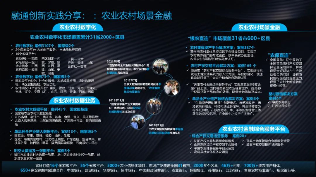 另一方面,基于新场景的服务创新。伴随产业数字化进程的发展,将会诞生很多新的业态或新的场景,基于这些新的场景,通过数智金融的创新服务,可以帮我们的金融机构将能力进一步的延展,或者弥补原来的短板。例如,在农业生产中,现在国家正在推动农业单品大数据平台的建设,通过大数据平台将整个产业的全流程实现数字化管理,这就为我们的涉农金融服务的创新,创造了条件。目前,神州信息基于苹果、茶叶、生猪等多个国家级或者省市大数据平台,联合一些大行或者区域城商行,推出了面向产业不同环节的金融服务,让更多涉农组织和个体能够获得便捷普惠的金融服务。