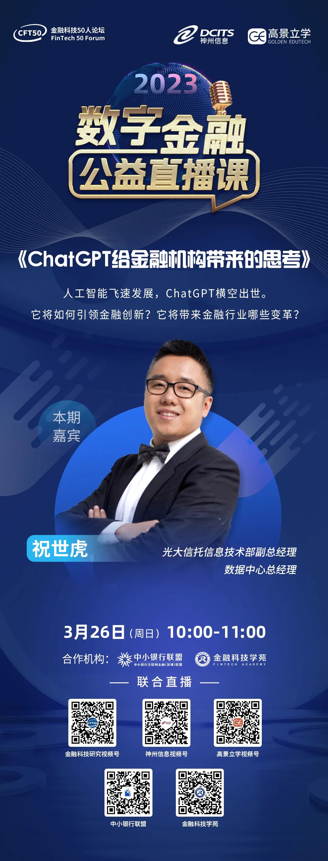数字金融公益直播课 | 光大信托信息技术部副总经理、数据中心总经理祝世虎《ChatGPT给金融机构带来的思考》,本周日开讲
