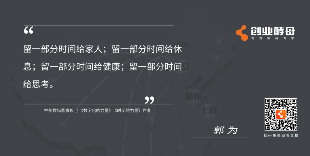 导语:时间管理,之于企业,之于人生有什么意义?如何做好时间管理?如何把时间花在最重要的战略管理上?如何以时间管理打造组织领导力?……在5月16日,今年会与创业酵母联合举办的《时间的力量——企业时间管理实践与思考》直播对谈中,神州信息董事长、《时间的力量》作者郭为与创业酵母创始人张丽俊围绕“时间管理、战略管理、组织变革、团队管理、领导力”等话题深度探讨,以下为直播内容精选。